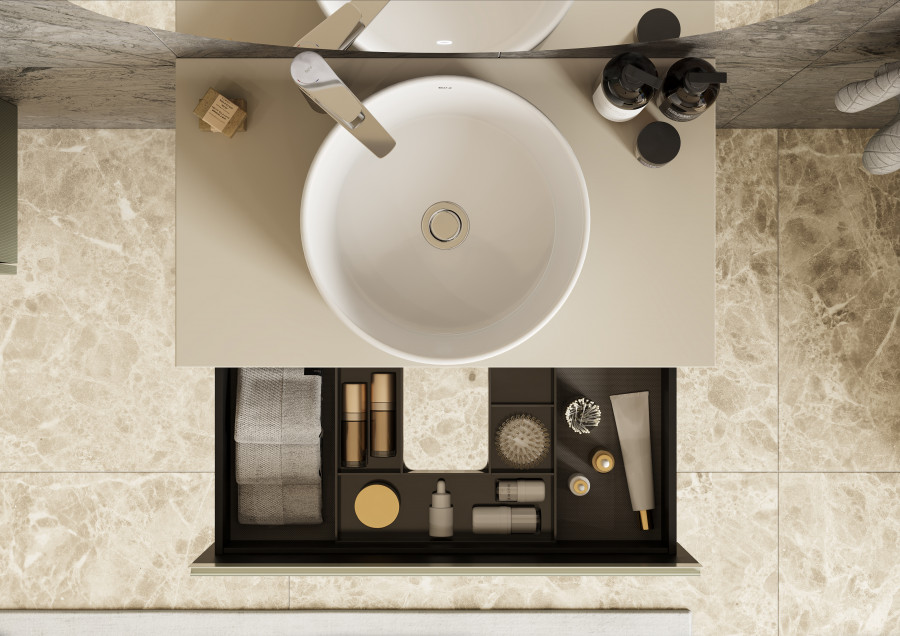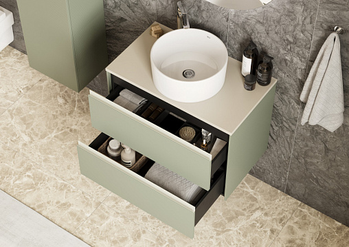 Модули Ona обладают следующими характеристиками и преимуществами. Удобная металлическая профильная ручка во всю ширину модуля обеспечивает легкость открывания ящиков и защиту фасадов от влаги, ударов и износа. В обоих ящиках находятся противоскользящие коврики, а верхний ящик снабжен также встроенной организацией пространства – эстетика и идеальный порядок в ванной комнате. Комфортное и долговременное использование мебели гарантировано благодаря направляющим Hettich полного выдвижения и плавного открывания и закрывания, протестированных на 60 000 циклов. Навесы входят в комплект и выдерживают нагрузку 100 кг, а также обладают функцией регулировки, которая позволяет скомпенсировать неровность стен и установить мебель ровно. Модули Ona комплектуются раковинами Ona из долговечного композитного материала.