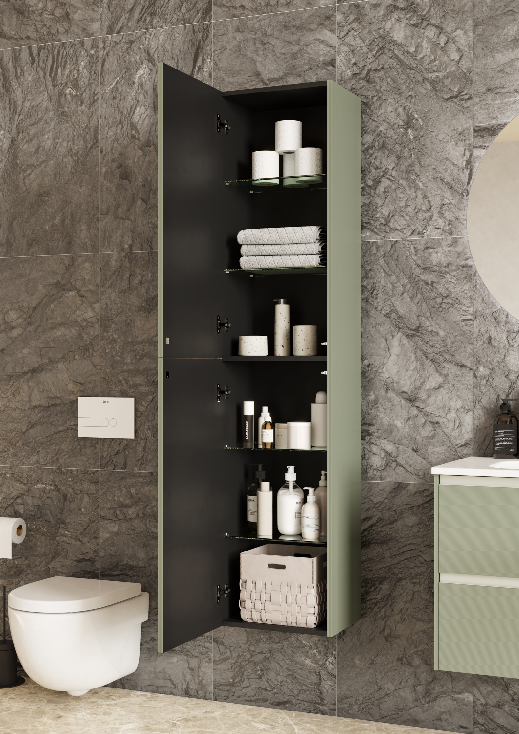 Шкаф-колонна Ona 40х30х175 см, Olive, оливковый матовый, реверсивная установка двери, подвесной монтаж, система push-to-open